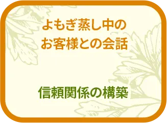 よもぎ蒸し中のリラックスタイムには、体調や日常のこともお話しいただきやすくなります。お客様との距離が縮まり、信頼関係が深まります。